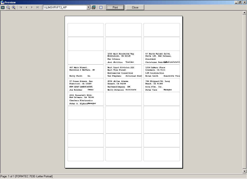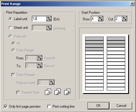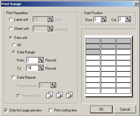 3. Printing the labels connected with the database, Data Unit radio box is used. Data Unit printing is used when printing following data. When printing All data, select All radio box. When printing the data in desired range, select Data Range radio box and input the numbers desired starting record and ending record in From and To textbox. Printing multiple copys of the same labels by data, select Data Repeat checkbox and input repeated number in Repeat Count textbox. If Only first page preview checkbox is selected, only the first page is showed. If you view all the pages, deselect Only first page preview checkbox. If you print only the part of data, Input the range of data, and If you print multiple sheets of a label, input the number desired in Repeat count textbox.